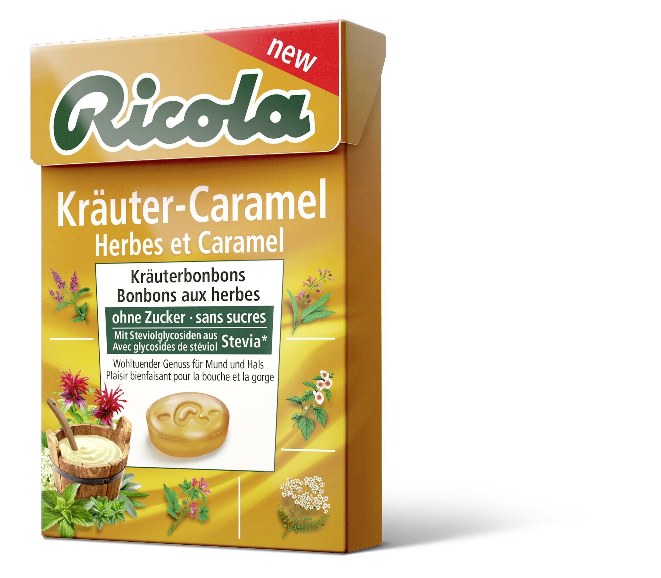 Un bonbon qui vaut de l'or, du moins pour le palais: Ricola lance le premier bonbon aux herbes et au caramel qui, grâce au fameux mélange de 13 plantes et à la précieuse mélisse d'or, conjugue le goût frais des herbes à une note douce de caramel, pour une saveur inédite et surprenante.