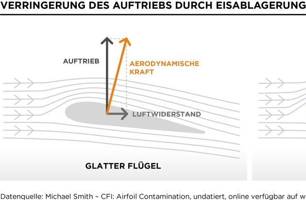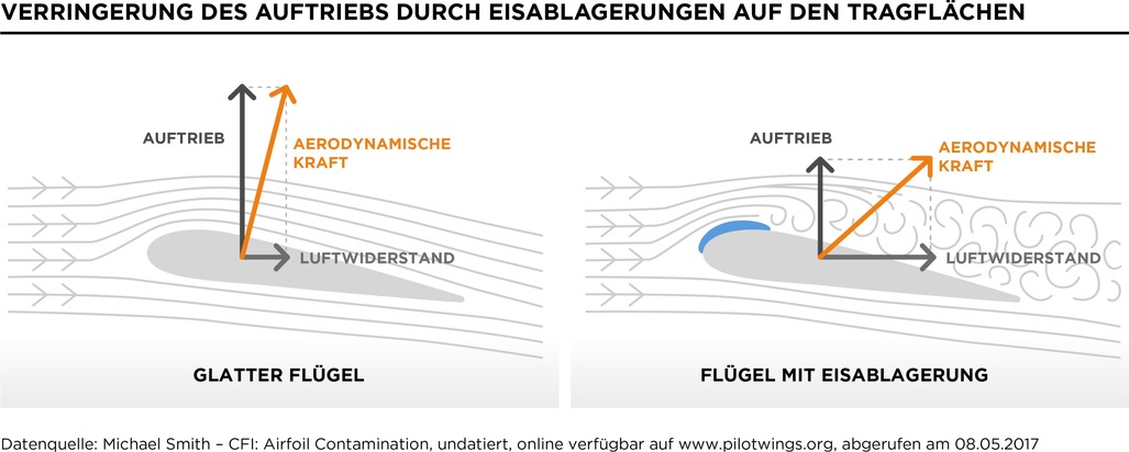 Noch gefährlicher ist, wenn Eis die Flugeigenschaften eines Flugzeuges komplett verändert. So baut sich etwa Eis nahezu unsichtbar auf den Flügeln oder am Leitwerk auf. Es verändert das Flügelprofil, so dass die Strömung am Flügel abrupt abreisst, in der Fachsprache «Stall» genannt. Und plötzlich hört das Flugzeug auf zu fliegen. Schon eine hauchdünne Eisschicht mit der Rauheit von Schleifpapier kann eine verheerende Wirkung haben, wenn sie während dem Flug die meist unsichtbare aerodynamische Trennschicht über der Oberseite des Flügels verwirbelt.