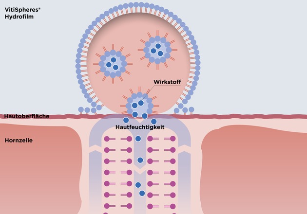Einmal aufgetragen, bildet die Hülle von VitiSpheres® wie eine Sonnencreme einen Film gegen äussere Einflüsse. Diese Schicht schützt den Wirkstoff auch auf der Haut vor Sauerstoff und vermeidet so die Oxidation. Zudem ist der Film wasserundurchlässig. Er schliesst damit Feuchtigkeit an der Hautoberfläche ein und vermeidet, dass sie verdunstet. Wie in der Sauna öffnen sich dadurch die mikroskopisch kleinen Übergänge in den äussersten Hautschichten und ermöglichen es den Wirkstoffen, in die Haut einzudringen. Wichtig ist dabei, dass nur der Wirkstoff und nicht das Trägermedium oder eben der VitiSpheres®-Film in die Haut eindringt. Der Film ist biologisch abbaubar und wird später beim Duschen abgewaschen, wie jede andere Body Lotion oder Sonnencreme.