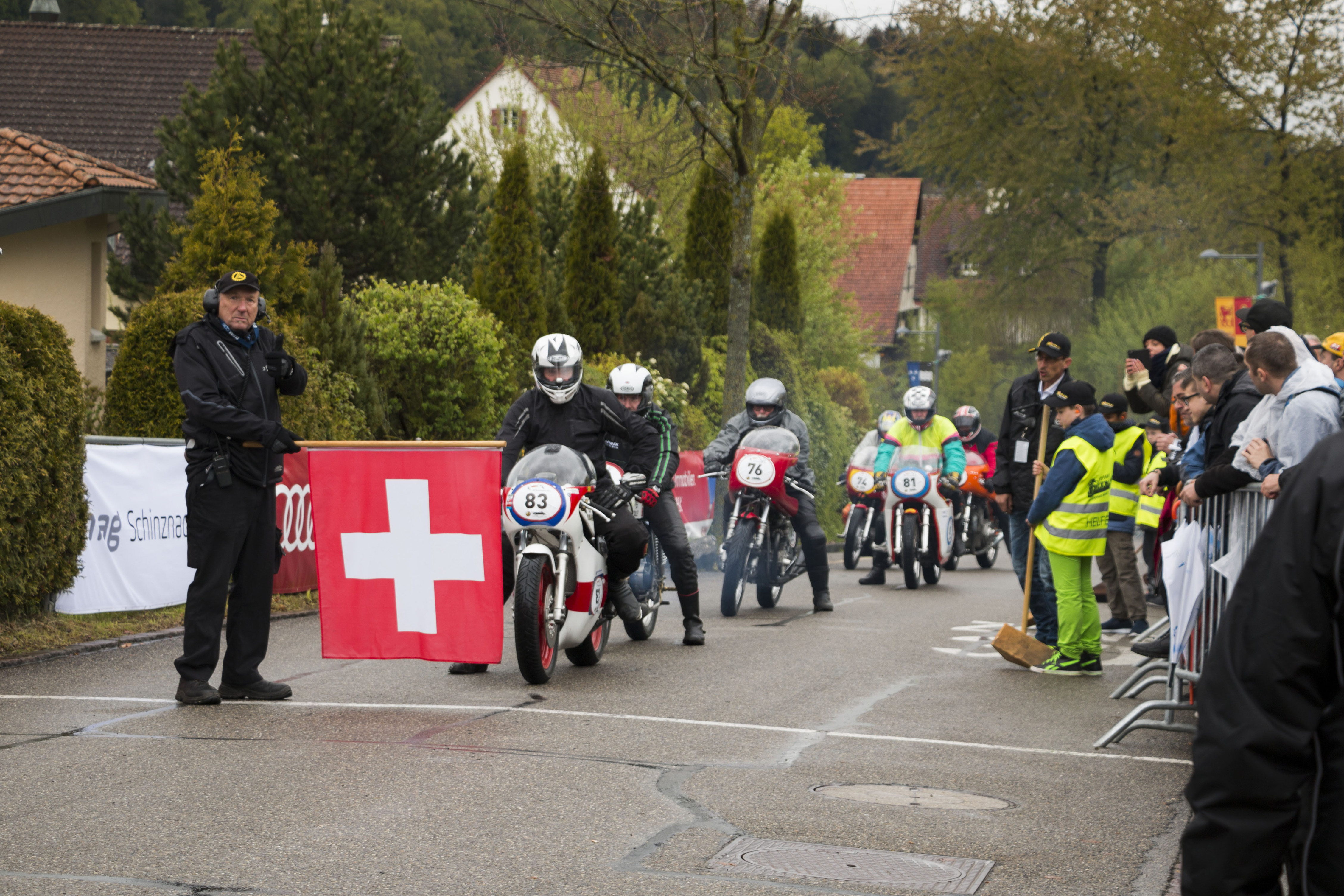 Am Samstag arbeiteten viele Helferinnen und Helfer beim Aufbau der Strecke, des Wagenparkes, der Verpflegungsstände und der Beschallung. Die ganze Infrastruktur war bereit für den grossen Tag. Am Sonntag konnte Sepp Ludin, der ACS-Rennleiter, pünktlich um 8.20 Uhr den ersten Lauf starten. Eröffnet wurde der GP Mutschellen mit der Startnummer 1 von Guido Wälchli auf seiner Moto Guzzi aus dem Jahr 1924, welche damals den ersten Grand Prix von Europa gewann. Es folgten weitere Solorennmaschinen aus der Vorkriegszeit. Trotz feuchtkaltem Wetter füllten sich die Zuschauer-Plätze nach der Gottesdienstpause. Im Fahrerlager freuten sich viele Besucher über das hautnahe Erlebnis mit ihren Lieblingsfahrzeugen und deren standhaften Piloten. Es wurde gefachsimpelt, fotografiert, gestaunt und viel gelacht.