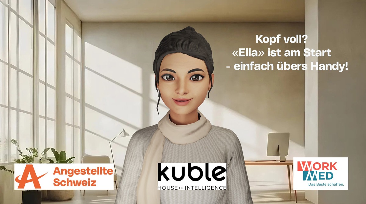 Avec "Ella", la collaboration fructueuse entre l'association d'employé-es Angestellte Schweiz, WorkMed AG et Kuble - House of Intelligence AG franchit une nouvelle étape. WorkMed propose des solutions innovantes pour le traitement, la prévention et l'intégration des personnes souffrant de troubles psychiques et de maladies mentales sur le marché du travail. Kuble accompagne les entreprises et les équipes dans la transformation vers l'IA grâce à des conseils, des formations continues et des solutions IA personnalisées. Angestellte Schweiz s'engage depuis plus de 100 ans en faveur de bonnes conditions de travail, de manière dynamique, fiable et utile. L'entreprise dispose de psychologues du travail dans l' équipe.