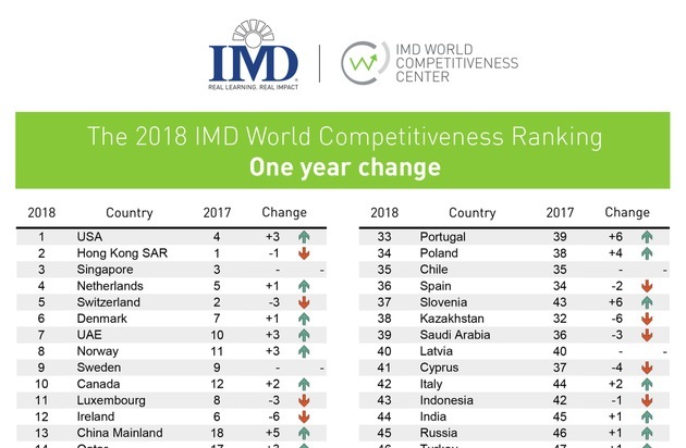 The Netherlands moves one place to 4th, while Switzerland moves down to 5th. The Netherlands' advancement shows a "balanced" path to competitiveness, ranking in the top 10 in economic performance, government and business efficiency. Switzerland declines mainly due to a slowdown in exports and an increase in perceptions about threats of relocation of R&D facilities.
