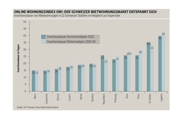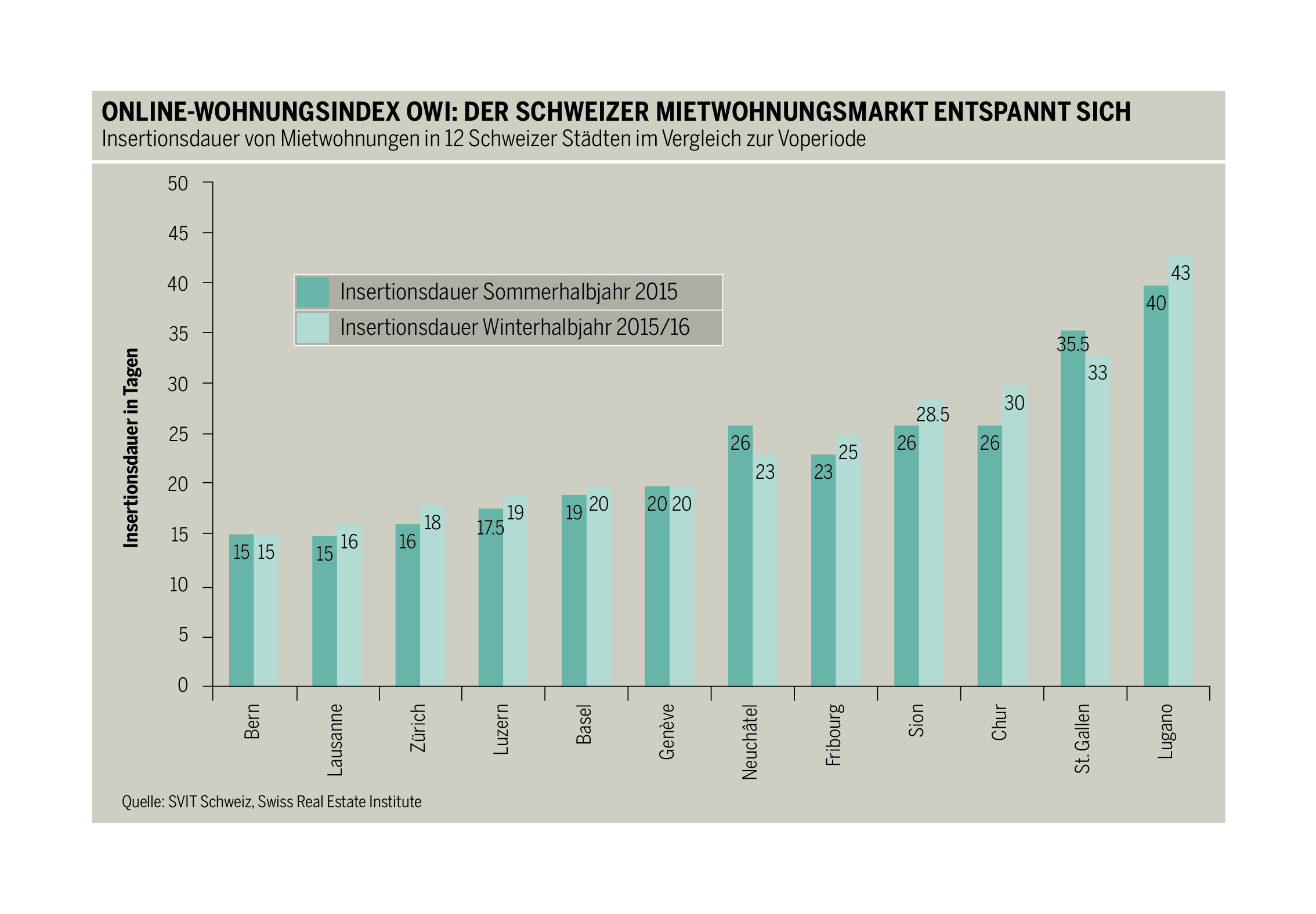 Die Insertionszeiten von Mietwohnungen auf Internetplattformen haben sich im Winterhalbjahr 2015/16 merklich verlängert. Diese Entspannung ist durch die gestiegene Zahl der freien Wohnungen begründet. Das Angebot am Schweizer Mietwohnungsmarkt hat im Vergleich zur Vorperiode deutlich zugenommen. Dies zeigt der Online-Wohnungsindex (OWI) des SVIT Schweiz und des Swiss Real Estate Institute. Das Angebot in Bern und für kleine Wohnungen bleibt eng.