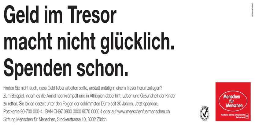 Die Stiftung Menschen für Menschen Schweiz startet eine ungewöhnliche Aktion, mit der sie die Schweizer Bevölkerung auf die Dürrekatastrophe in Äthiopien aufmerksam machen will. Inserate in Zeitungen und Radiospots verkünden: "Geld im Tresor macht nicht glücklich. Spenden schon."