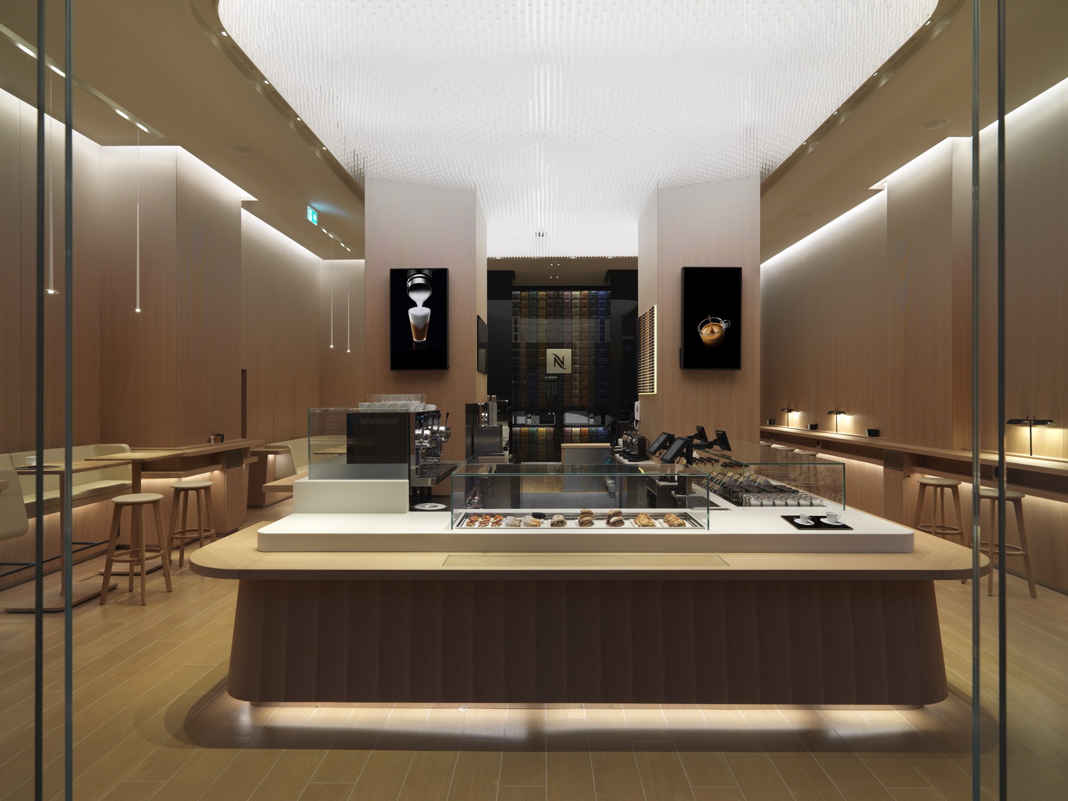 Le Café Nespresso propose aux amateurs de café l'occasion unique de jouir de l'expérience haut de gamme Nespresso à leur propre rythme. Combinant de façon parfaite un design esthétique à une technologie d'avant-garde, le Café Nespresso affiche des matériaux de haute qualité, un éclairage élégant et une musique douce, pour proposer une atmosphère raffinée et relaxante unique. La clientèle peut goûter les cafés grand crus Nespresso et une gamme de plus de 20 recettes alléchantes de café permanentes et saisonnières préparées par des serveurs compétents qui sont aussi là pour partager leur connaissance développée des cafés de meilleure qualité de Nespresso. Ceux-ci proviennent des 1 à 2 % des meilleurs cafés au monde qui correspondent à nos exigences strictes en termes de qualité et de type d'arôme.