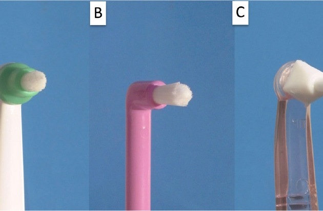 Une brosse à dents sonique électrique à tête compacte et deux brossettes interdentaires manuelles (une seule touffe de poils) ont fait l'objet de tests en laboratoire à l'aide d'une machine à brosser spéciale sur des modèles et sur des mandibules de porc. Le mode de brossage était le même que ce que pratique un patient moyen.