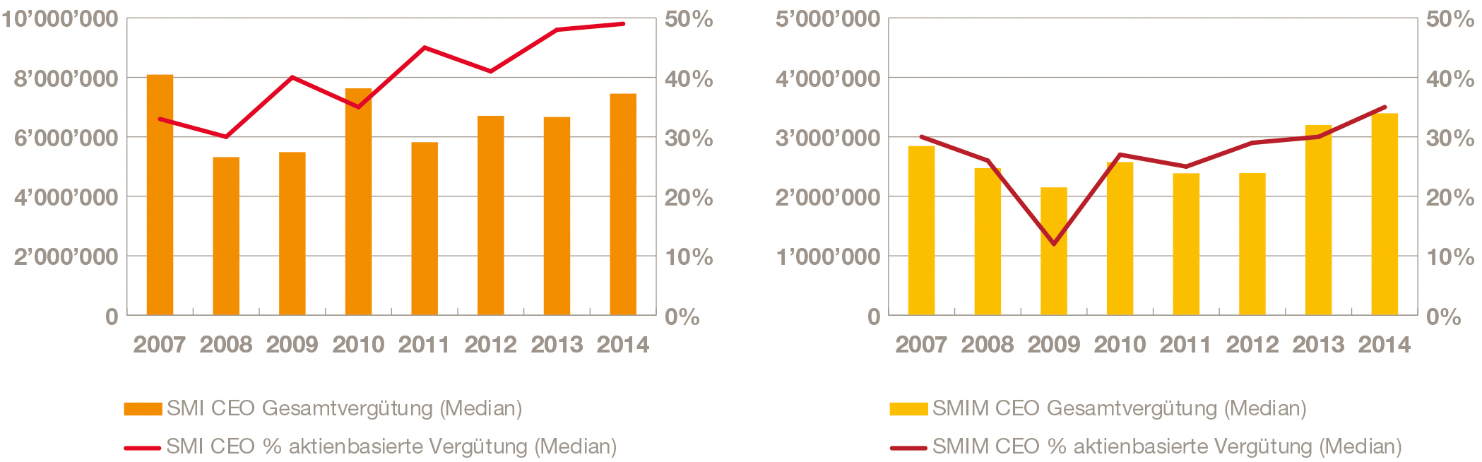 Der Vermögenshebel der CEOs ist ebenfalls stark angestiegen: 2008 hielt der Median-CEO in SMI- und SMIM-Unternehmen in seinem Vermögen Aktien seines eigenen Unternehmens in einem Wert, der etwa 1,6 Mal bzw. 1 Mal so gross war wie sein Basissalär. 2014 hält er solche in einem Wert, der 7 Mal bzw. 4 Mal so gross ist wie sein Basissalär.