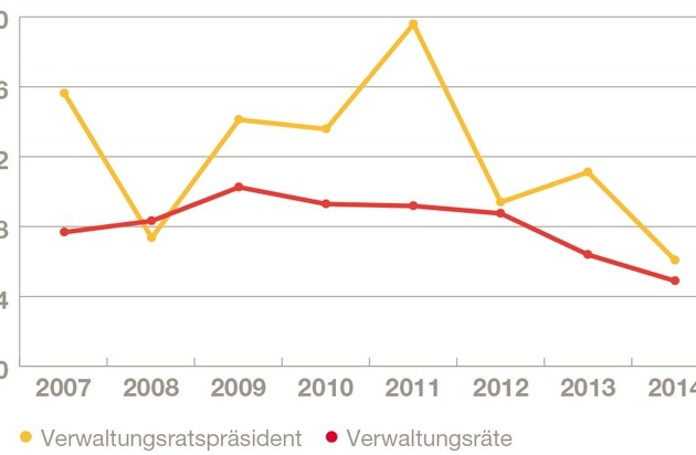 Seit 2007 stieg die Vergütung von Verwaltungsratspräsidenten - sowohl bei SMI- als auch bei SMIM-Unternehmen - von etwas unter einer Mio. CHF auf 1,1 Mio. CHF (SMI, +12,4 Prozent) bzw. von 380'000 CHF auf 690'000 CHF (SMIM, +80 Prozent). Bei Small-Cap-Unternehmen beträgt die Medianvergütung von Verwaltungsratspräsidenten 310'000 CHF. Sie ist gegenüber 2007 leicht gesunken, seit 2008 aber stark gestiegen. Ein SMI-Verwaltungsrat verdiente 2014 310'000 CHF (+3,6 Prozent seit 2007), ein SMIM-Verwaltungsrat 210'000 CHF (+22,8 Prozent) und ein Small-Cap-Verwaltungsrat 120'000 CHF (+11,4 Prozent).