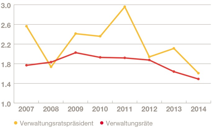 Depuis 2007, la rémunération des présidents de conseils d'administration a augmenté, tant dans les entreprises du SMI que dans celles du SMIM, passant respectivement de 1 à 1,1 million de CHF (SMI, +12,4 %) et de 380 000 à 690 000 CHF (SMIM, +80 %). Pour les entreprises « Small Cap », la rémunération médiane des présidents de conseil d'administration s'élève à 310 000 CHF, en léger recul par rapport à 2007, mais en forte augmentation depuis 2008. En 2014, un administrateur d'entreprises du SMI gagnait 310 000 CHF (+3,6 % depuis 2007), un administrateur d'entreprises du SMIM 210 000 CHF (+22,8 %) et les membres de conseils d'administration d'entreprises « Small Cap » 120 000 CHF (+11,4 %).