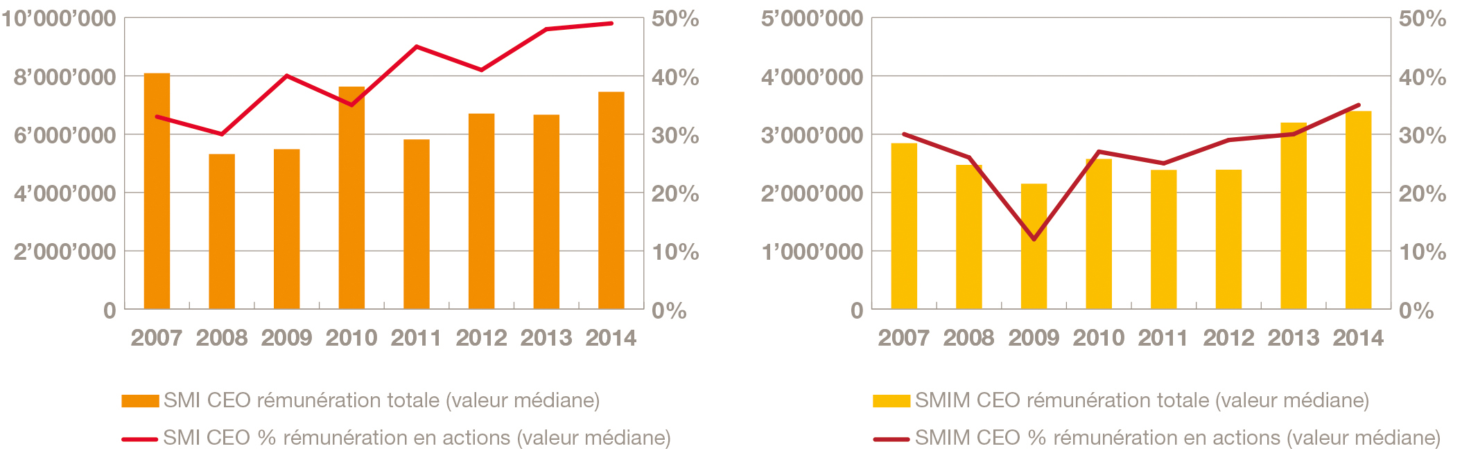 Les rémunérations des CEO ont augmenté de 11,8 % en 2014 pour les entreprises du SMI, de 6,2 % pour celles du SMIM et de 11 % pour les entreprises « Small Cap ». Au total, la rémunération médiane des CEO du SMI a baissé de 8,1 millions de CHF à 7,5 millions de CHF au cours des huit dernières années (-7,9 %). En revanche, pour les entreprises du SMIM et les Small Cap, elle se situe, avec 3,4 millions de CHF et 1,4 millions de CHF, respectivement 19,4 % et 16,1 % au-dessus du niveau de 2007.