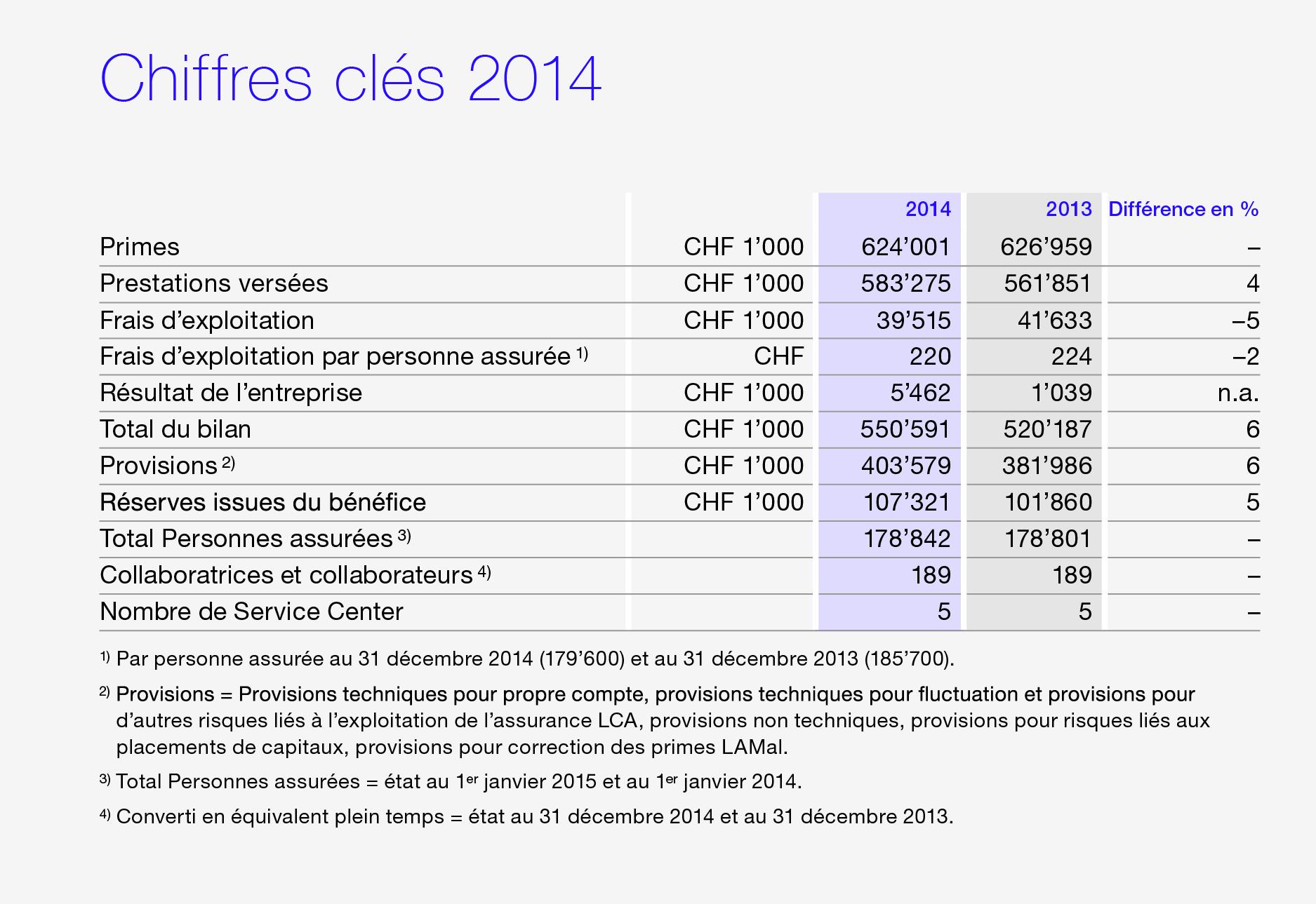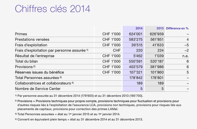 Au cours de l'exercice 2014, Atupri a enregistré un bénéfice de 5,5 millions de francs. C'est un résultat très réjouissant qui dépasse d'ailleurs de 4,4 millions de francs celui de 2013. Les recettes des primes s'élèvent à près de 624 millions de francs tandis que le montant des dépenses au titre des prestations s'élève quant à lui à 583 millions de francs. Les provisions de 404 millions de francs ont ainsi été renforcées de 6 %. Nous avons pu réduire les charges d'exploitation de 5 % l'année dernière. Avec un coût unitaire de 3,6 %, Atupri se situe largement en dessous de la moyenne de la branche, qui est d'environ 5 %. Grâce également au rendement de ses placements de capitaux de 8,25 %, Atupri peut continuer à s'affirmer comme assureur-maladie en bonne santé et faisant preuve d'efficacité. D'autres chiffres clés se trouvent dans le graphique. Pour de plus amples informations, veuillez vous référer au rapport de gestion 2014; les possibilités de commandes sont mentionnées tout en bas.