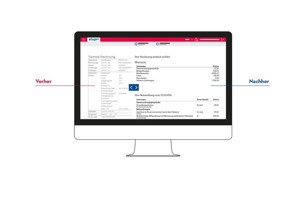 «Wir sind sehr erfreut, dass die Software, die wir gemeinsam mit der ZHAW entwickelt haben, im Gesundheitswesen nun erstmals zum Einsatz kommt», sagt Rolf Schmidiger, Innovationsmanager der Suva. «Wir hoffen, dass dies künftig Branchenstandard wird.» Das Übersetzungstool von Atupri steht im Kundenportal myAtupri automatisch zur Verfügung. Wer die Hilfe in Ansprung nehmen möchte, zieht mit der Maus einen Schieber über die Rechnung und schon erscheint die Übersetzung der einzelnen Kategorien und Leistungen in einer verständlichen Sprache. Statt «Applanationstonometrie» steht nun beispielsweise «Augenuntersuchung». Aktuell können mehrere 10'000 Bezeichnungen übersetzt werden und auch die englische Sprache wurde integriert. Endet.