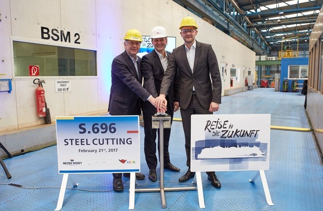 Am 21. Februar 2017 brach auf der Meyer Werft in Papenburg ein neues Zeitalter der Kreuzschifffahrt an. AIDA Präsident Felix Eichhorn und Meyer Werft Geschäftsführer Bernard Meyer vollzogen den symbolischen ersten Stahlschnitt für das weltweit erste Kreuzfahrtschiff, das komplett mit umweltfreundlichem Flüssigerdgas (LNG) betrieben werden kann.