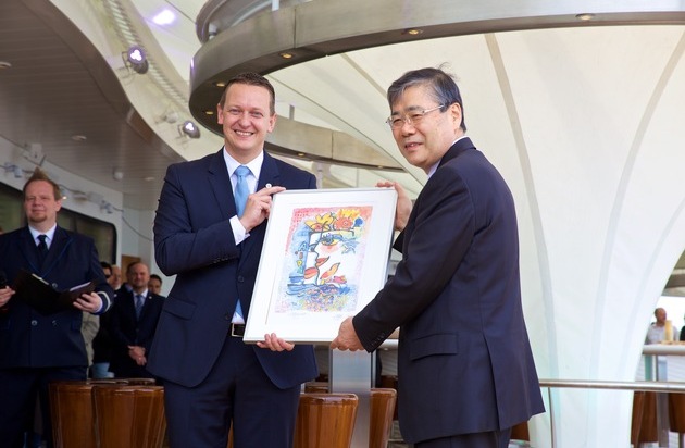 AIDA Cruises hat heute (27. April 2017) in Nagasaki (Japan) AIDAperla von Mitshubishi Heavy Industries (MHI) übernommen. Die feierliche Indienststellung des zwölften Flottenmitgliedes von AIDA Cruises erfolgte in Anwesenheit von Michael Thamm, CEO Costa Group, Felix Eichhorn, President AIDA Cruises, Shunichi Miyanaga, President and CEO MHI, und Kazuaki Kimura, President and CEO, Industry & Infrastructure MHI, im Rahmen einer traditionellen japanischen Zeremonie. AIDAperla wird in den nächsten Tagen Kurs aufs Mittelmeer nehmen, wo sie am 30. Juni 2017 von Model und Moderatorin Lena Gercke in Palma de Mallorca getauft wird.