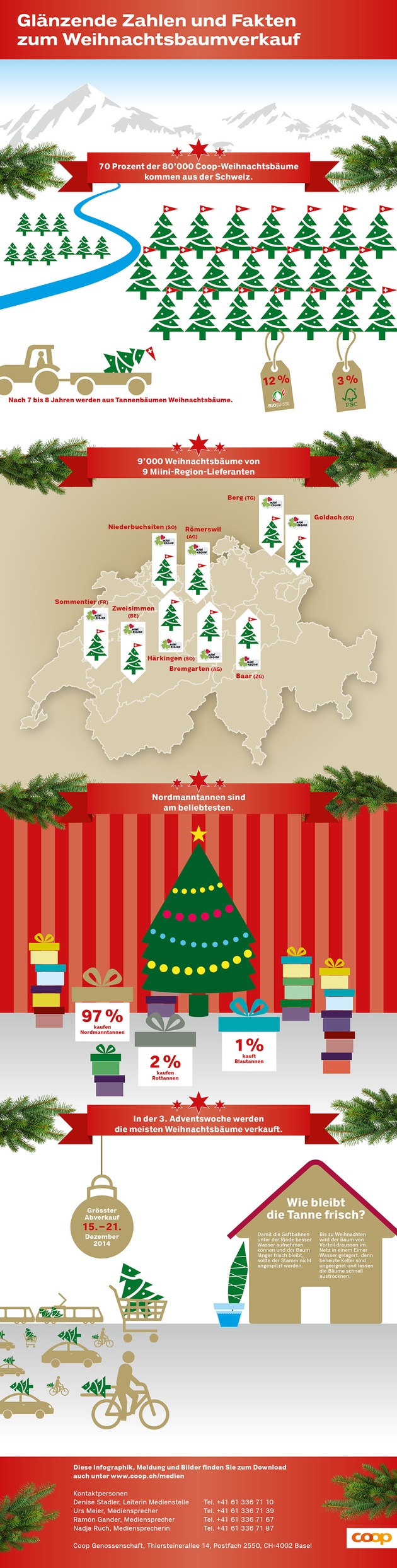 Jeweils ab Mitte November bietet Coop ihren Kundinnen und Kunden vor grösseren Supermärkten sowie bei Coop Bau+Hobby Baumärkten eine grosse Auswahl an Weihnachtsbäumen an. Die Nordmanntanne ist mit 97 Prozent die beliebteste Sorte in der Schweiz - gefolgt von der Rot- und der Blaufichte. Die Nordmanntanne besticht durch ihre überdurchschnittlich lange Haltbarkeit und lässt fast keine Nadeln fallen. Zusätzlich zu den herkömmlichen Tannenbäumen werden noch 20'000 eingetopfte Tannen verkauft. Auch immer mehr künstliche Weihnachtsbäume finden den Weg in Schweizer Stuben: jährlich hat Coop rund 8'000 von diesen im Verkauf.