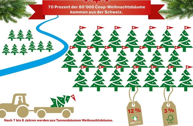 Jedes Jahr kaufen 56'000 Kundinnen und Kunden eine Tanne aus Schweizer Kulturen bei Coop, was die regionale Produktion stärkt und lange Transportwege vermeidet. Eine Zusammenarbeit mit 28 Schweizer Lieferanten und der IG Suisse Christbaum ermöglicht dieses Angebot. 12 Prozent dieser einheimischen Tannen sind bio. Unter Oecoplan verkauft Coop Bio-Suisse-zertifizierte-Tannen aus biologisch geführten Baumschulen. Für eine nachhaltige Forstwirtschaft steht das Weihnachtsbaumsortiment mit dem Gütesiegel von Forest Stewardship Council (FSC).