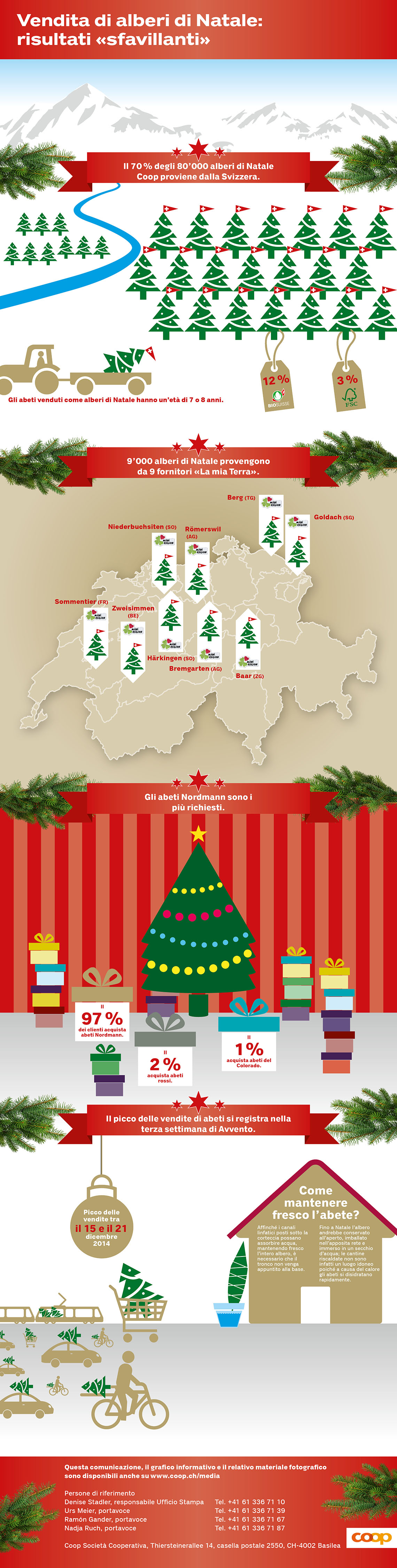 Ogni anno a partire da metà novembre, Coop propone davanti ai supermercati e ai centri Coop Edile + Hobby una ricca gamma di alberi di Natale. Con il 97% gli abeti Nordmann sono i più apprezzati in Svizzera, seguiti dall'abete rosso e dall'abete del Colorado. L'abete Nordmann si conserva per un periodo più lungo rispetto alla media e non perde praticamente gli aghi. Inoltre, oltre ai tradizionali alberi di Natale si vendono anche 20'000 abeti in vaso. Nelle case svizzere si trovano anche sempre più alberi di Natale sintetici: Coop ne vende circa 8'000 all'anno.