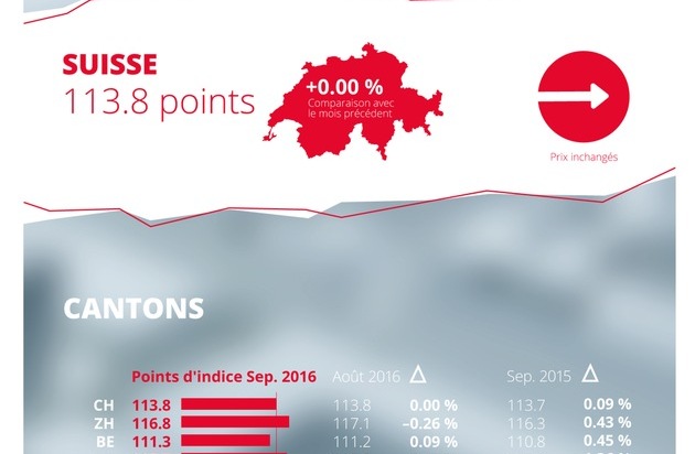 En septembre, les loyers proposés en Suisse sont restés inchangés. L'indice «Suisse» de homegate.ch s'est établi à 113.8 points. Par rapport au même mois de l'année précédente, les loyers ont augmenté de 0.09 pour cent. Dans les cantons de Vaud et Genève, les loyers ont augmenté de 0.16 pour cent.