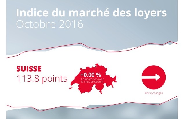 En octobre 2016, les loyers proposés en Suisse sont restés inchangés. L'indice «Suisse» de homegate.ch s'est établi à 113.8 points. Par rapport au même mois de l'année précédente, les loyers proposés sont restés inchangés aussi. Dans les cantons de Vaud et de Genève, les loyers proposés ont baissé de 0,65 pour cent.