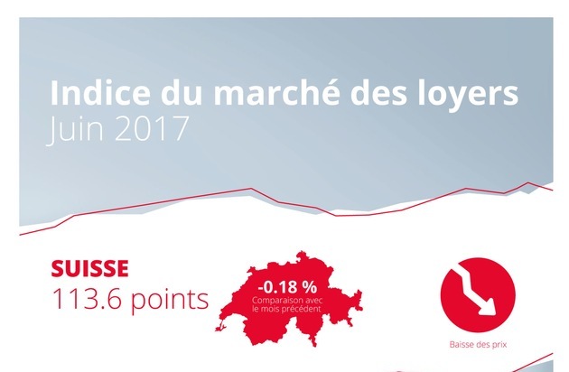 En juin 2017, les loyers proposés en Suisse ont baissé de 0,18 pour cent et l'indice se situe ainsi à 113,6 points. Par rapport au même mois de l'année précédente, les loyers proposés en Suisse ont baissé de 0,26 pour cent. Dans les cantons de Vaud et de Genève, ils ont enregistré une hausse de 0,40 pour cent.