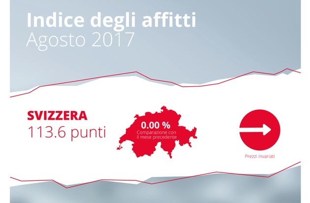 Nel mese di agosto 2017, in Svizzera, i canoni d'affitto sono rimasti invariati. L'indice Svizzera si attesta a 113,6 punti. Rispetto allo stesso mese dello scorso anno, i canoni di locazione in Svizzera registrano una flessione di 0,18 percento. Il canton Ticino ha fatto registrare un incremento dei canoni di locazione offerti pari allo 0,09 percento.