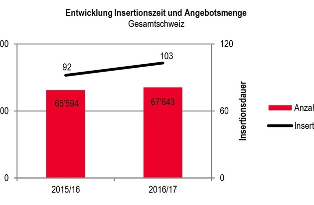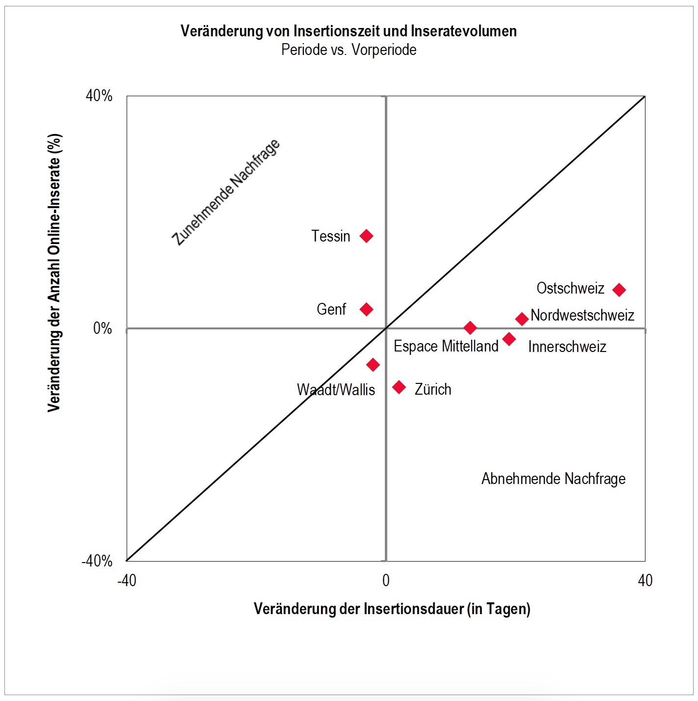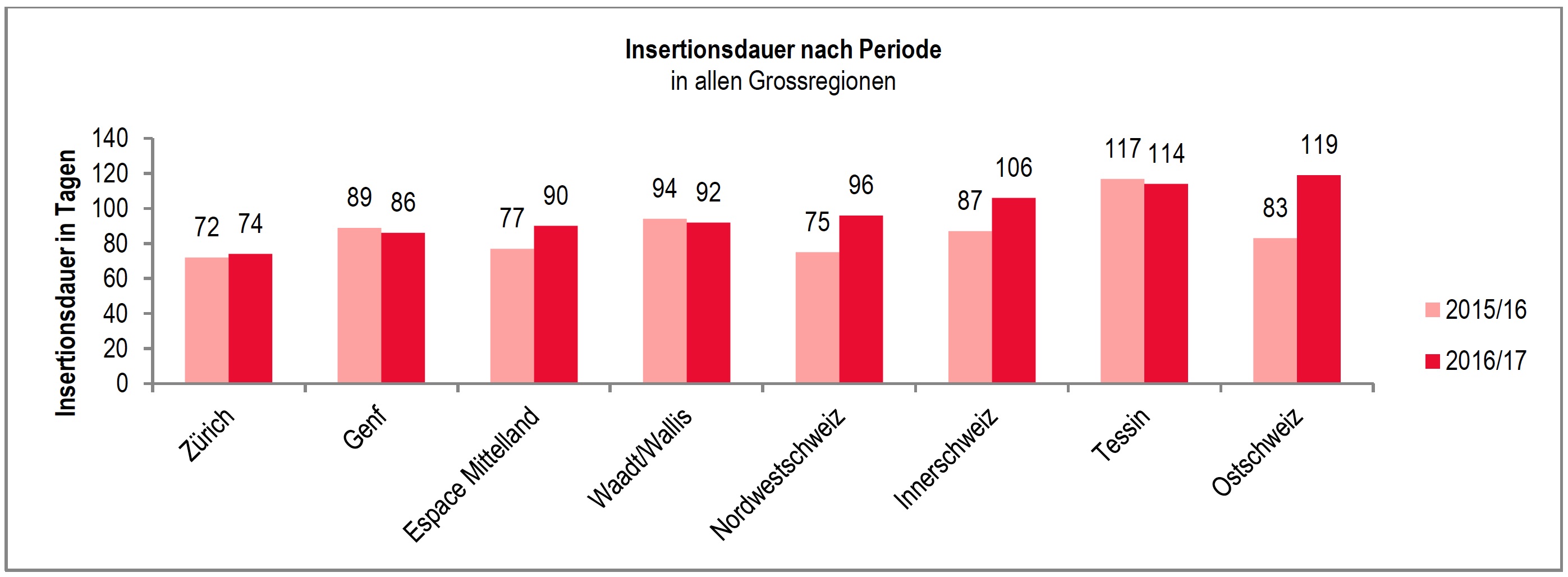 Im Vergleich zur Vorperiode sind vor allem in der Ostschweiz (+36 Tage), der Nordwestschweiz (+21 Tage) und der Innerschweiz (+19 Tage) sehr starke Anstiege der Insertionsdauer zu verzeichnen. Nur die Regionen Genf (-3 Tage), Tessin (-3 Tage) und Waadt/Wallis (-2 Tage) konnten sinkende Insertionsdauern aufweisen.
