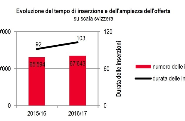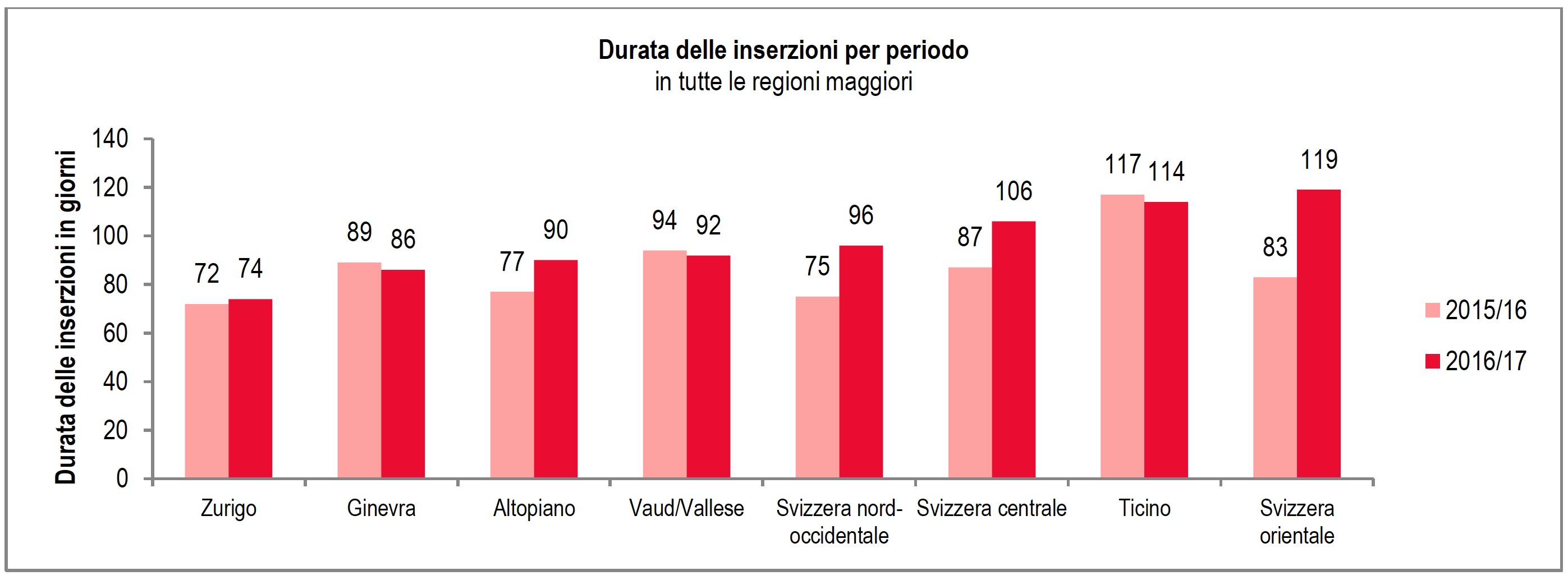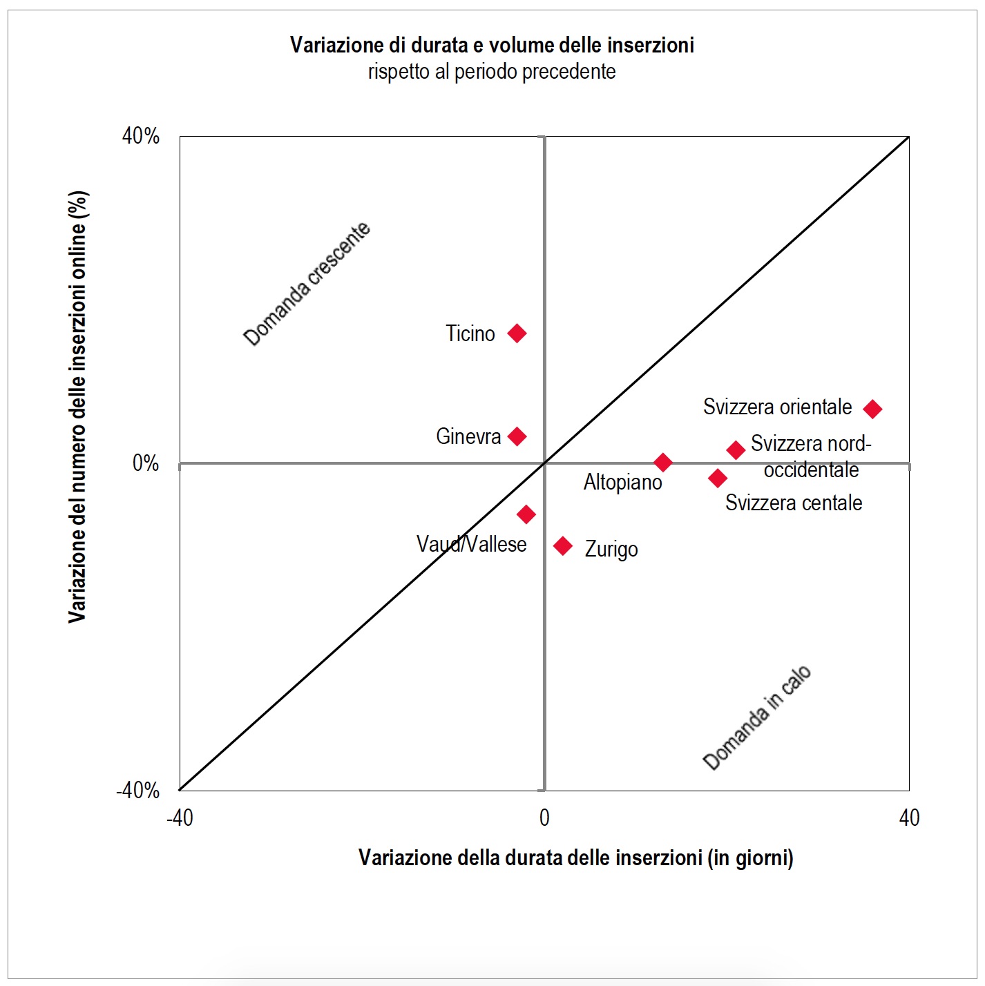 A confronto con il periodo precedente si assiste a forti aumenti della durata delle inserzioni soprattutto nella Svizzera orientale (+36 giorni), nella Svizzera nord-occidentale (+21 giorni) e nella Svizzera centrale (+19 giorni). Solo la regione di Ginevra (-3 giorni), il Ticino (-3 giorni) e i cantoni Vaud e Vallese (-2 giorni) hanno mostrato un calo della durata delle inserzioni.
