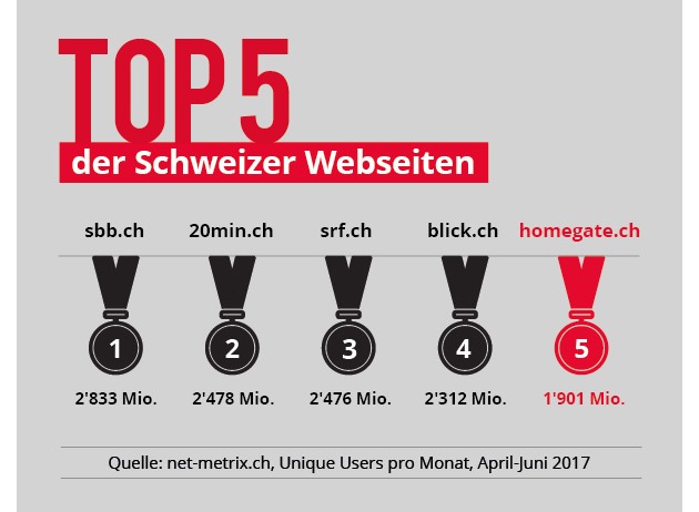 NET-Metrix, die unabhängige Schweizer Instanz für Internet-Nutzungsforschung, hat unlängst ihre regelmässig erscheinende Online-Währungsstudie für das zweite Quartal 2017 veröffentlicht. Mit 1.9 Millionen Nutzerinnen und Nutzern im Monat ist homegate.ch erstmals unter den Top 5 der reichweitenstärksten Websites der Schweiz vertreten.