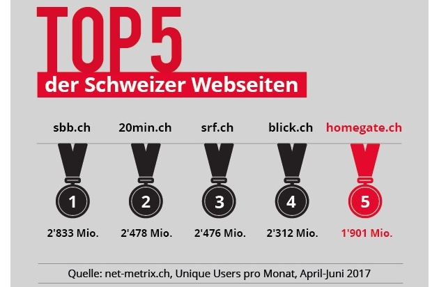 NET-Metrix, die unabhängige Schweizer Instanz für Internet-Nutzungsforschung, hat unlängst ihre regelmässig erscheinende Online-Währungsstudie für das zweite Quartal 2017 veröffentlicht. Mit 1.9 Millionen Nutzerinnen und Nutzern im Monat ist homegate.ch erstmals unter den Top 5 der reichweitenstärksten Websites der Schweiz vertreten.