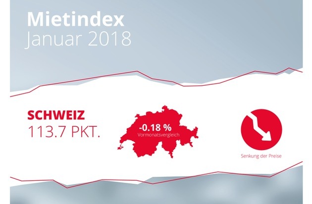 Im Januar 2018 sinken die Angebotsmieten in der Schweiz um 0.18 Prozent. Der Index Schweiz steht bei 113.7 Punkten. Im Vergleich zum Vorjahresmonat sinken die Mieten um 0.26 Prozent. Im Kanton Zürich sinken die Angebotsmieten gegenüber dem Vormonat um 0.17 Prozent.