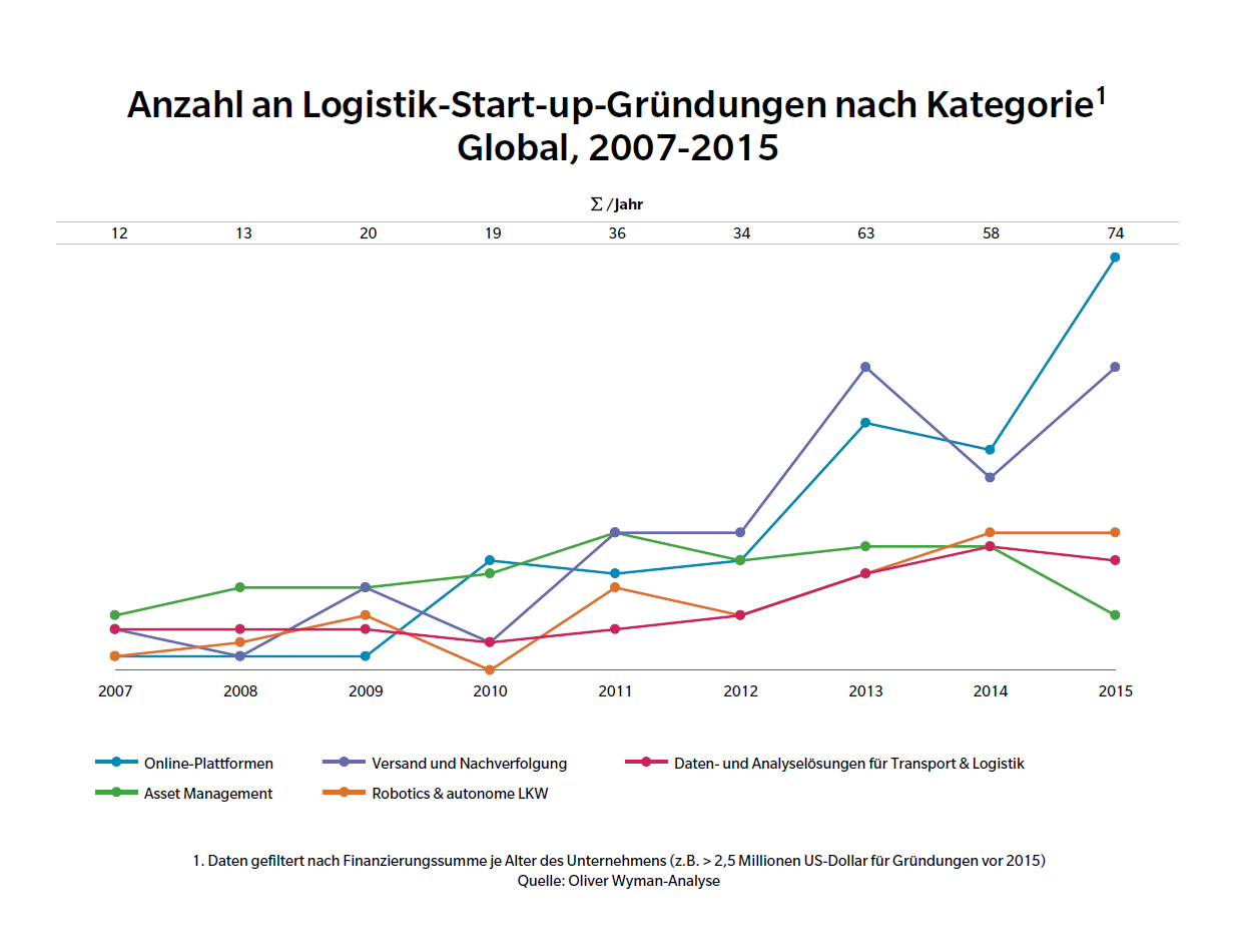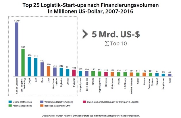 Als Standort global führender Unternehmen wie Kühne + Nagel und Panalpina nimmt die Schweiz weltweit eine der Spitzenpositionen in der Logistik ein. Der Gesamtumsatz der Branche in der Schweiz liegt bei gut 40 Milliarden Schweizer Franken pro Jahr. Ob die Schweiz Branchenprimus bleibt, hänge auch davon ab, "wie es den Logistikern gelingt, ihr Geschäft zu digitalisieren", sagt Max-Alexander Borreck, Principal bei Oliver Wyman: "Viele Logistiker tun sich schwer, mit dem Tempo der Digitalisierung Schritt zu halten. Start-ups hingegen sind flexibel und müssen nicht auf gewachsene Strukturen Rücksicht nehmen. Und sie beherrschen dieselben Big-Data-Ansätze wie die Start-ups aus der Personenmobilität, für die Uber das bekannteste Beispiel ist. Mit dieser Agilität und diesem Wissen können die innovativen Newcomer zu Schrittmachern der Branche werden."