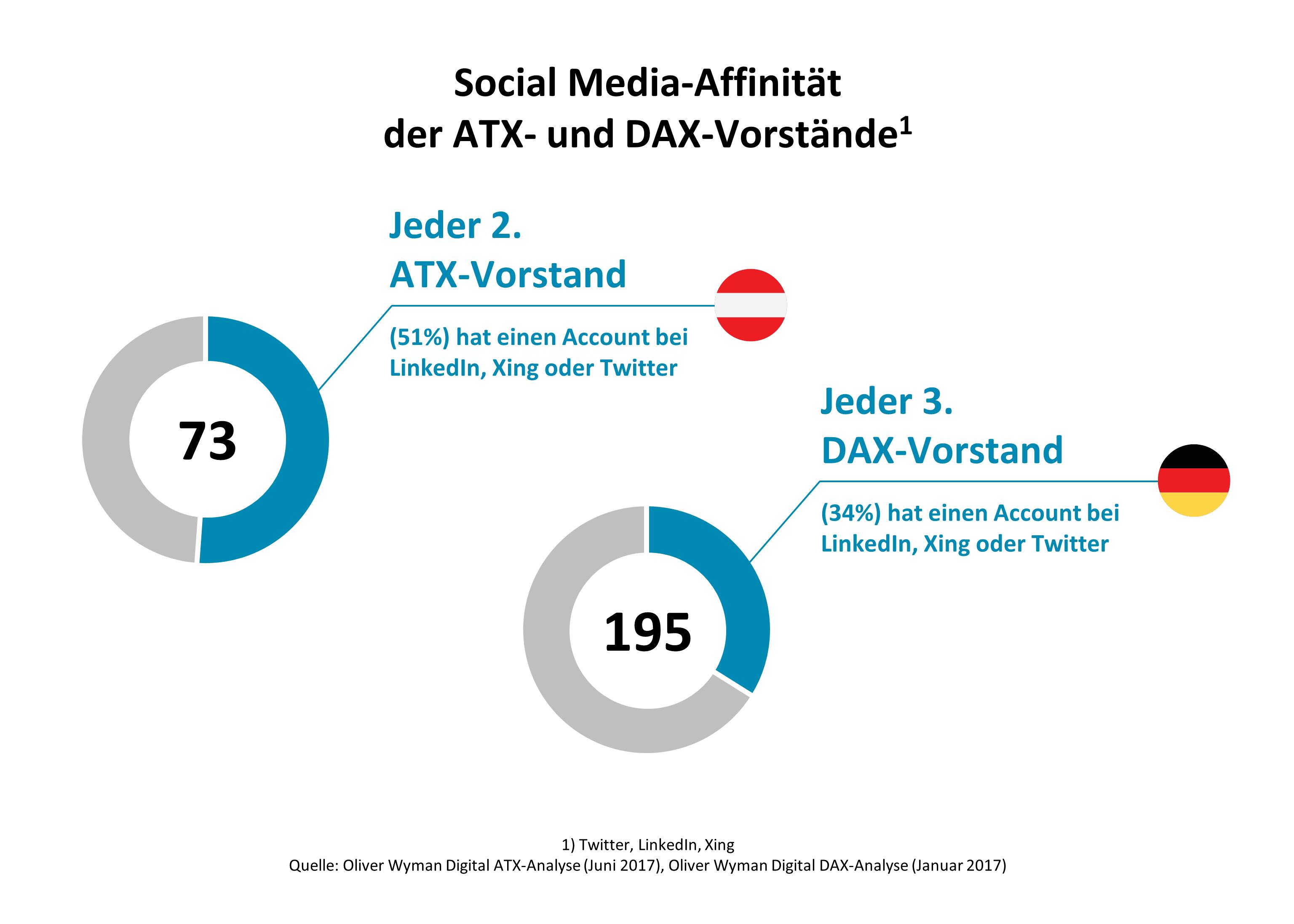 Die Vorstände der ATX-Unternehmen zeigen erstaunliche Zurückhaltung, wenn es um Social Media geht. Nur 51 Prozent verfügen über einen Account bei LinkedIn, Xing oder Twitter. Eine Analyse der Strategieberatung Oliver Wyman zeigt: Immerhin überflügeln sie damit noch die Kollegen aus dem DAX. Unter Deutschlands Top-Vorständen profilieren sich nur 34 Prozent im sozialen Netz. Eine Frage drängt sich auf: Können sich die Chef-Digitalisierer der Wirtschaft solche Abstinenz überhaupt leisten?