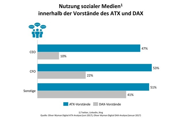 Für die Analyse "Digital ATX" untersuchte Oliver Wyman alle ATX-Vorstände hinsichtlich Präsenz in den sozialen Netzwerken LinkedIn, Twitter und Xing. (Erhebung: Mai 2017; Vergleichzahlen aus dem DAX: Januar 2017)