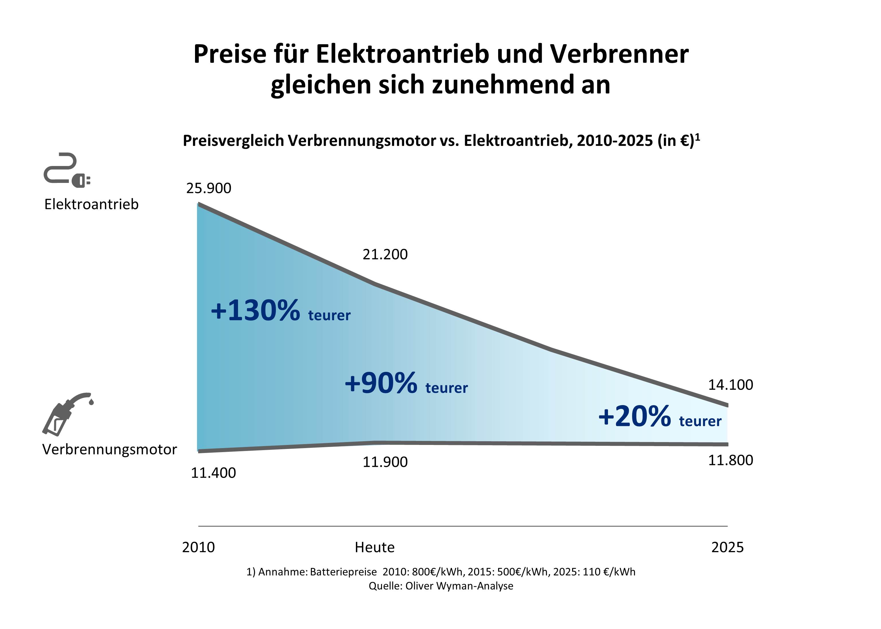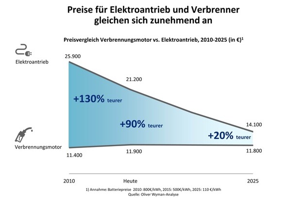 Damit könnte sich der Spielraum für die Zulieferer stark verringern. "Die bislang wichtigen Module für traditionelle Motoren und Antriebsstränge werden dramatisch an Bedeutung verlieren", sagt Reiner. "Die Wertschöpfung wandert hin zur Batterie." Hochspannungskabelsysteme, Leistungselektronik oder Antriebsmanagement rücken in den Fokus. Das wirkt sich auch auf die Produktionstechnik aus: Noch vorherrschende Guss- und Drehmaschinen werden zunehmend durch Wickelmaschinen ersetzt, die für den Bau von Elektroantrieben nötig sind. Die Kosten für Elektroantriebe und Verbrennungsmotoren nähern sich dank leistungsfähigerer Batterien weiter an. Heute ist der Elektroantrieb der Oliver Wyman-Analyse zufolge noch fast doppelt so teuer wie der Verbrennungsmotor. Doch schon 2025 wird er im Schnitt nur noch knapp 20 Prozent teurer sein. "Auch das wird die Akzeptanz der E-Autos steigern", sagt Reiner.