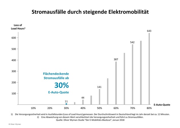 Ab einer E-Auto-Quote von 30 Prozent kommt es in Deutschland zu Engpässen bei der Stromversorgung. Unter den derzeitigen regulatorischen Rahmenbedingungen könnte in deutschen E-Mobilitäts-"Hotspots" bereits in fünf bis zehn Jahren regelmäßig der Strom ausfallen - ab 2032 ist damit flächendeckend in Deutschland zu rechnen. Auf diese Weise bedroht die wachsende Anzahl elektrisch angetriebener Autos die Stabilität der Stromversorgung und setzt die Netzbetreiber unter erheblichen Handlungsdruck. Die Oliver Wyman-Analyse "Der E-Mobilitäts-Blackout" zeigt eine Alternative zum konventionellen Netzausbau auf: die Flexibilisierung der Ladevorgänge. Hierfür gilt es, kurzfristig Rahmenbedingungen zu schaffen.