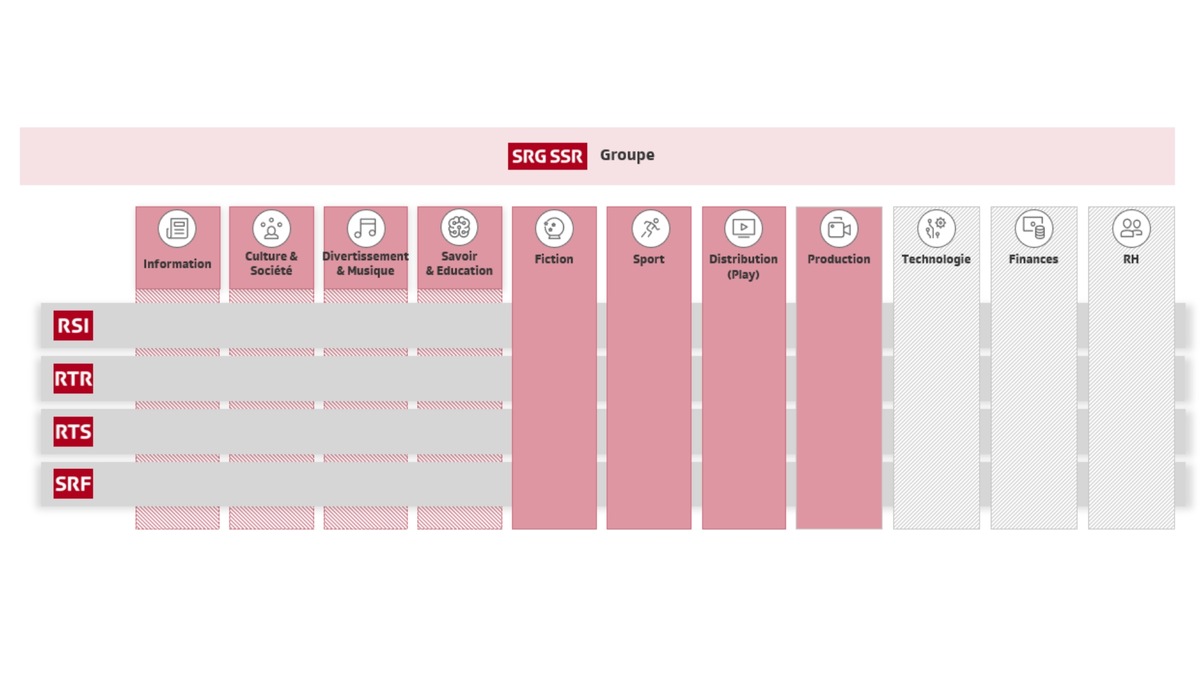 C'est ainsi que, par exemple, chaque région linguistique possède ses propres domaines fonctionnels, comme les finances, les ressources humaines, ainsi que les services technologie/IT. La SSR ne dispose pas d'un système uniforme de mesure des résultats ni de normes nationales pour la planification et le pilotage de la production. Et seuls 3 à 5% des contenus de la SSR sont utilisés par plus d'une unité d'entreprise. A l'avenir, la SSR entend mettre en place une collaboration plus étroite entre les régions, dans le but qu'elles développent de manière conjointe des contenus pouvant être diffusés dans les quatre régions linguistiques et culturelles suisses.