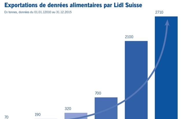 Lidl Schweiz konnte 2015 trotz des starken Schweizer Frankens die Exporte gegenüber dem Vorjahr um rund 30% steigern. 2710 Tonnen Schweizer Qualitätsprodukte wurden exportiert.