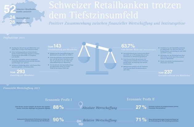 La société de conseil zurichoise IFBC analyse chaque année la rentabilité et la création de valeur financière des 52 banques de détail suisses prises en compte dans l'étude Wertschaffung der Schweizer Retailbanken, tant individuellement que par catégorie.