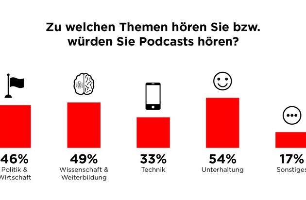 - Verbraucher sehen größtes Potenzial in VR/AR und Livestreams - 51 Prozent der Deutschen haben bereits einen Podcast gehört - Messenger-Angebote von Medien werden kritisch gesehen - Mehrheit möchte für neue Medienformate kein Geld ausgeben