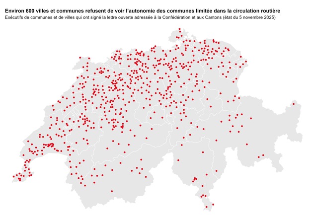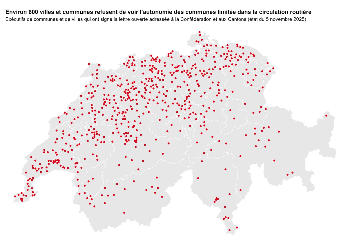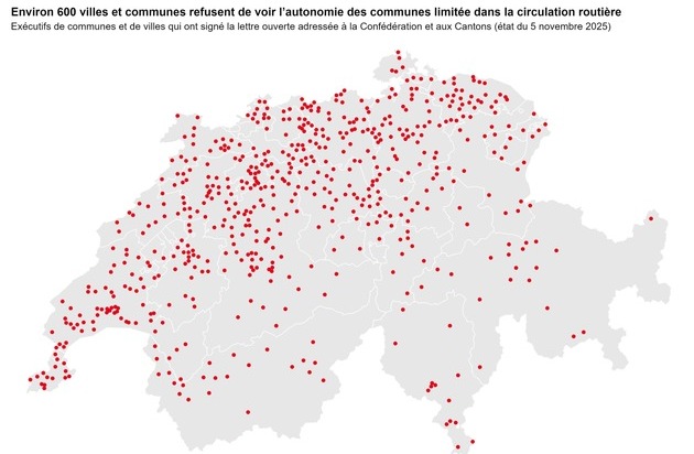 Plusieurs centaines de villes et de communes demandent expressément à la Confédération et aux cantons de respecter le partage des tâches entre les échelons de l'État et de ne pas restreindre davantage la marge d'appréciation et de manoeuvre des communes en matière de mesures de circulation. Environ 600 exécutifs de communes et de villes de la Suisse entière et de toute appartenance politique ont signé une lettre ouverte sur ce sujet. Ils se réfèrent à la proposition de mise en oeuvre du Conseil fédéral sur la motion 21.4516 "Consolider la hiérarchie du réseau routier à l'intérieur comme à l'extérieur des localités". La motion vise à rendre plus difficile la mise en oeuvre de limitations de vitesse à 30 km/h sur ce que l'on appelle les routes "affectées à la circulation générale". Des initiatives similaires ont été déposées dans plusieurs cantons.