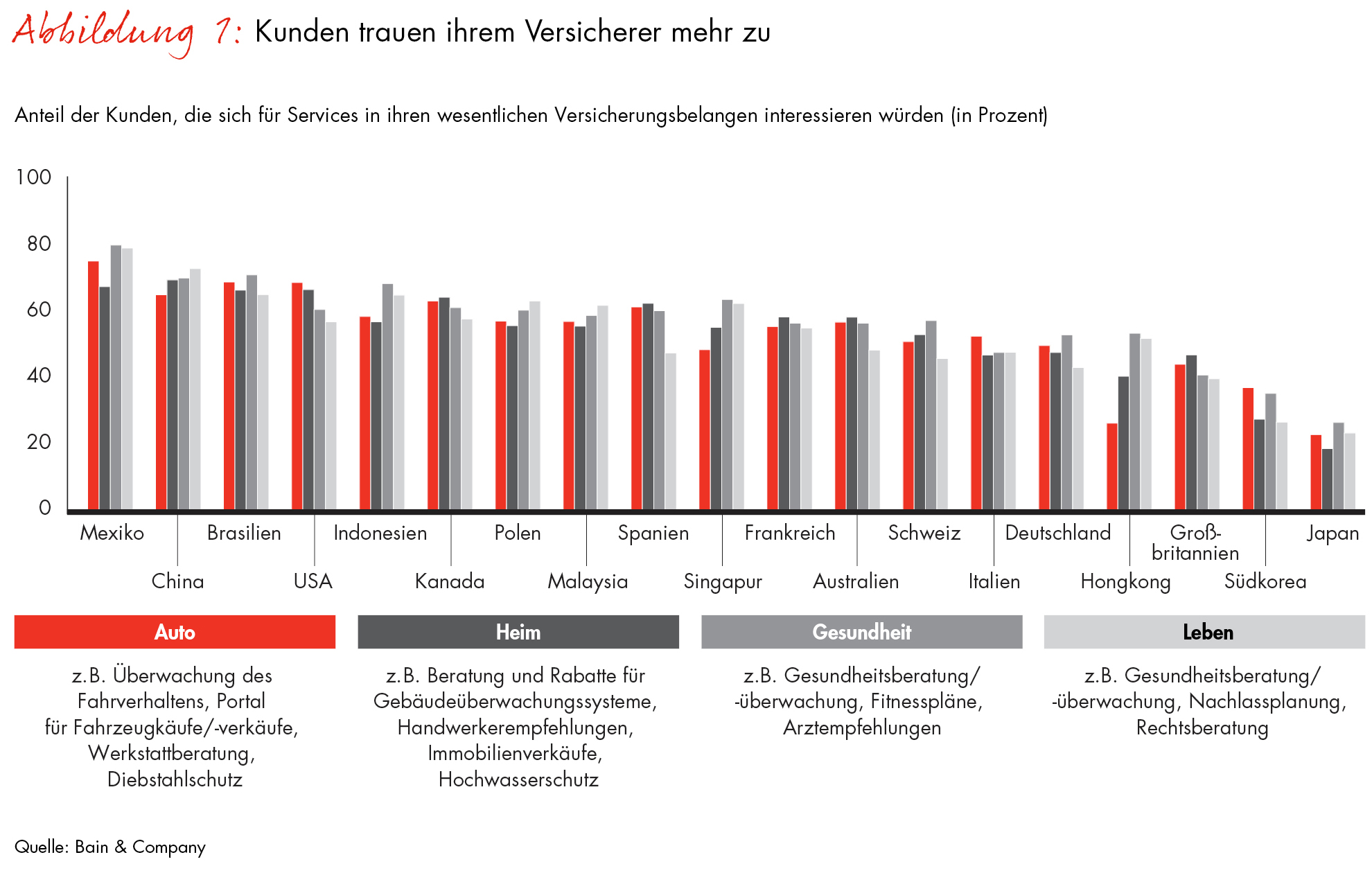 Basler die Nase vorn in einem insgesamt schwachen FeldNoch lassen die Schweizer Versicherer grosses Potenzial ungenutzt. Denn gut die Hälfte der Eidgenossen würde neben Policen auch andere Produkte und Dienstleistungen bei ihrer Versicherung kaufen. Das Spektrum reicht vom Pkw bis hin zur Mitgliedschaft in einem Fitnesscenter. Dies ergab die erstmalige Befragung von 4.500 Kunden grosser Schweizer Versicherer im Rahmen der weltweiten Studie "Customer Behavior and Loyalty in Insurance" der internationalen Managementberatung Bain & Company mit insgesamt 164.000 Versicherten in 19 Ländern. Dabei ist die Offenheit für zusätzliche Angebote der Versicherer in vielen Ländern noch grösser als in der Schweiz. Dies gilt vor allem für Schwellenländer wie Mexiko und China, aber auch für die USA (Abb. 1). Dr. Henrik Naujoks, Bain-Partner und Leiter der Versicherungs-Praxisgruppe in der Region EMEA, sieht darin eine Steilvorlage für die Branche: "Den Versicherern kann mit zusätzlichen Produkten und Dienstleistungen nicht nur der angestrebte Wandel vom Produkt- zum Lösungsanbieter gelingen. Vielmehr sind damit auch neue Umsatzpotenziale verbunden und die Möglichkeit, weitaus intensiver mit dem Kunden zu interagieren." Insbesondere Marktführer sind hier äusserst aktiv. Beste Beispiele sind die Mobiliar mit dem Kauf von 50 Prozent von Scout24 in der Schweiz, HUK-Coburg mit den günstigen Serviceangeboten ihrer Vertragswerkstätten und ihrem ersten Autohaus sowie Discovery mit weitreichenden Kooperationen im Gesundheitsbereich.