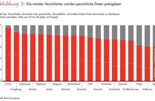In welchem Mass die Schweizer ihre Versicherung als Partner sehen, unterstreicht ein weiteres Studienergebnis. Über 50 Prozent der Befragten erklären, dass sie ihren Versicherern ausgewählte Daten über ihre Gesundheit, ihre Finanzen oder ihre Konsumgewohnheiten bereitstellen würden. Mehr als 20 Prozent wären sogar bereit, sämtliche Daten zu teilen. Mit diesen Werten liegt die Schweiz im internationalen Vergleich im oberen Mittelfeld. Noch grösser ist die Freigiebigkeit der Kunden hinsichtlich ihrer persönlichen Daten insbesondere in asiatischen Märkten (Abb. 2). "Das ist eine einmalige Chance für Versicherer", betont Naujoks. "Sie können mehr über die Bedürfnisse ihrer Kunden erfahren, auf dieser Basis gezielt mit innovativen Dienstleistungen die Kontaktfrequenz erhöhen und damit eine traditionelle Schwäche der Branche ausmerzen." Und er fügt hinzu: "Häufige Interaktionen sind und bleiben ein Schlüsselfaktor für eine hohe Kundenloyalität."