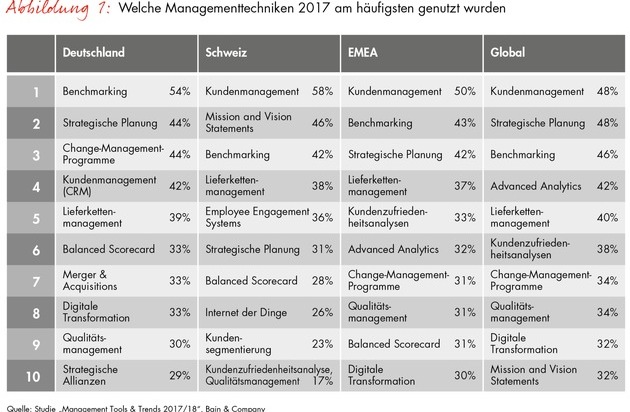 Zum 16. Mal veröffentlicht Bain & Company die weltweit umfangreichste Analyse der international dominierenden Managementinstrumente. Seit Erscheinen der ersten Studie "Management Tools & Trends" im Jahr 1993 hat Bain mehr als 14.000 Führungskräfte befragt. Allein für die diesjährige Ausgabe bewerteten über 1.000 Top-Manager aus Unternehmen aller Grössen und Industrien in Europa, Nord- und Lateinamerika sowie Asien ausgewählte Managementtrends sowie 25 ausgewählte populäre Managementinstrumente.