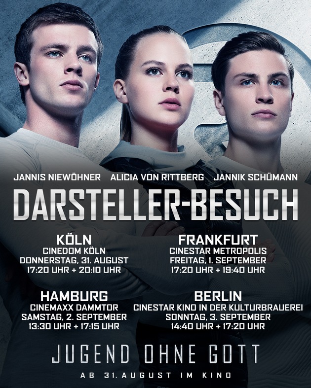 Erlebe die wunderbaren Schauspieler Jannis Niewöhner, Alicia von Rittberg und Jannik Schümann aus dem viel diskutierten Thriller JUGEND OHNE GOTT live in Deinem Kino! Aktuelle Tourdaten an diesem Wochenende:
