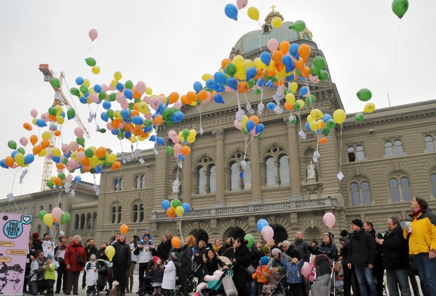 Für kurze Zeit gehörte heute Nachmittag der Berner Bundesplatz ganz den Familien: Es wimmelte von Kinderwagen, Ballonen, spielenden Kindern und Eltern. Sie versammelten sich auf Einladung von Pro Juventute, um auf die Abstimmung über den Familienartikel vom kommenden Sonntag aufmerksam zu machen. Als Höhepunkt der Versammlung liessen die Familien Hunderte von Ballonen in den Himmel steigen. Daran befestigt rufen Karten das Stimmvolk auf, am 3. März an der Urne ein 'Ja' einzulegen zum Familienartikel.