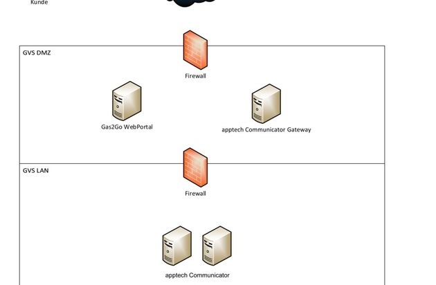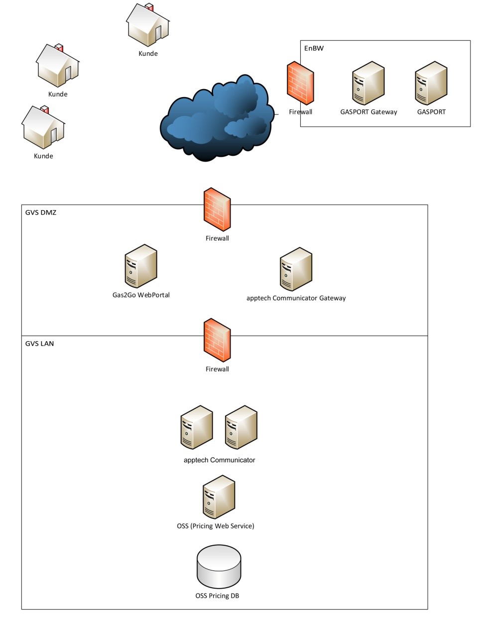 Die Gesamtlösung Gas2Go wurde, über verschiedene Applikationen verteilt, realisiert. Gas2Go Web Portal, OSS Pricing Service (GVS), GASPORT Pricing Service (EnBW) und der apptech Communicator sorgen dafür, dass die beteiligten Applikationen die benötigen Nachrichten schnell und sicher untereinander austauschen können.
