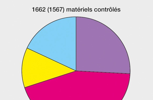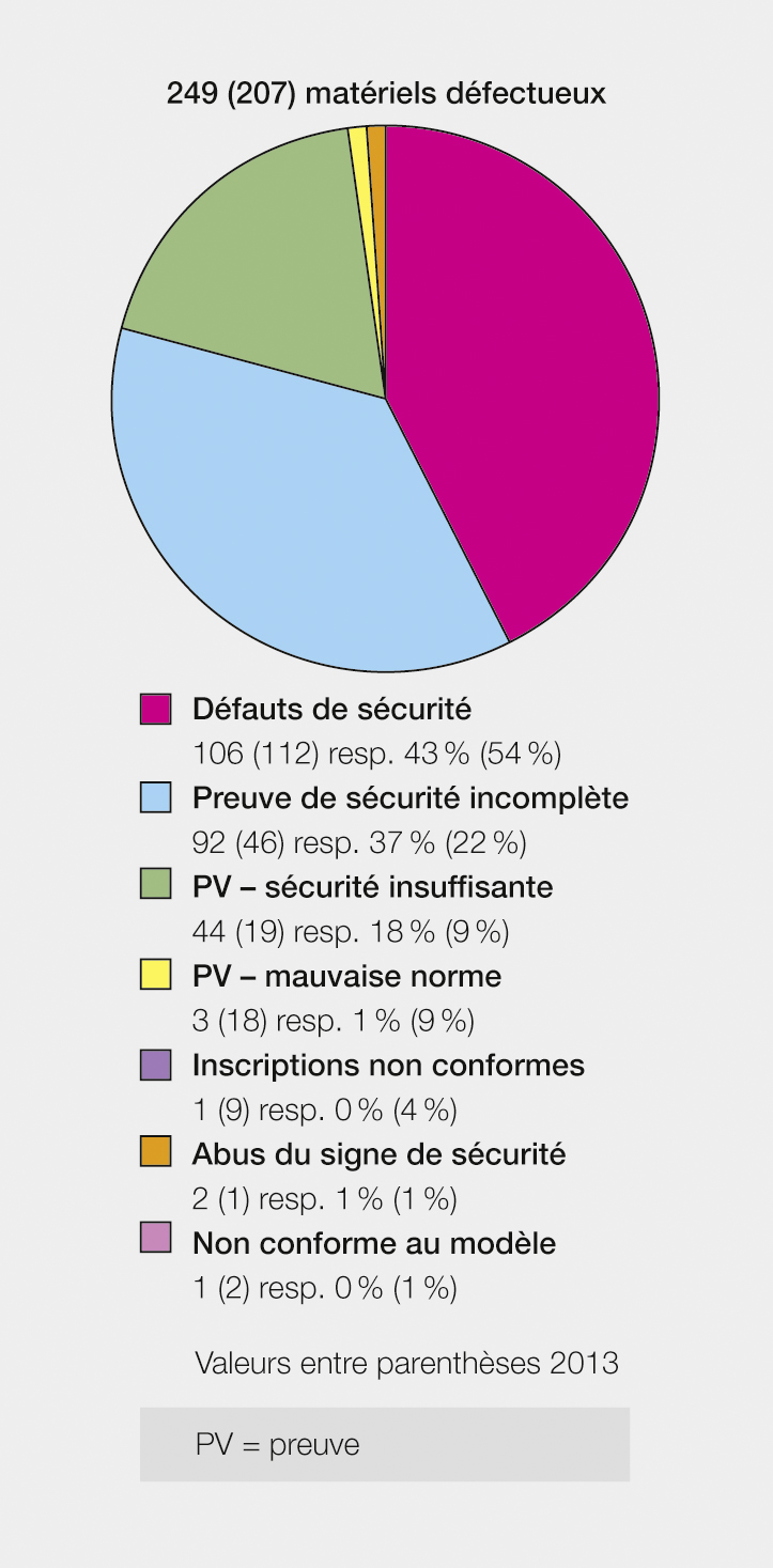 Au total, 249 matériels présentant des défauts ont été enregistrés. Ainsi, 15% de tous les matériels électrotechniques contrôlés présentaient des défauts. 106 d'entre eux comportaient des défauts de sécurité.
