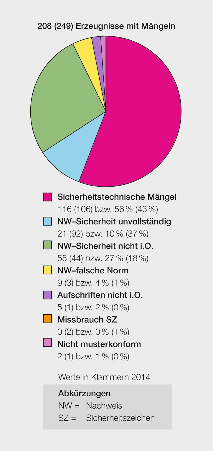 Die überprüften Erzeugnisse wurden anlässlich von Messebesuchen, Besuchen von Grossverteilern, Fachmärkten und Herstellern sowie im Rahmen von Kontrollen auf Internet-Plattformen und in Printmedien erfasst. Überprüfungen erfolgten auch aufgrund von Meldungen von Konsumenten, Mitbewerbern sowie Fachpersonen aus dem Elektrobereich. Gesamthaft wurden 208 Erzeugnisse mit Mängeln erfasst. Damit weisen, wie im Vorjahr, wiederum 15% aller kontrollierten elektrotechnischen Erzeugnisse Mängel auf. Dabei enthalten 116 Erzeugnisse sicherheitstechnische Mängel.