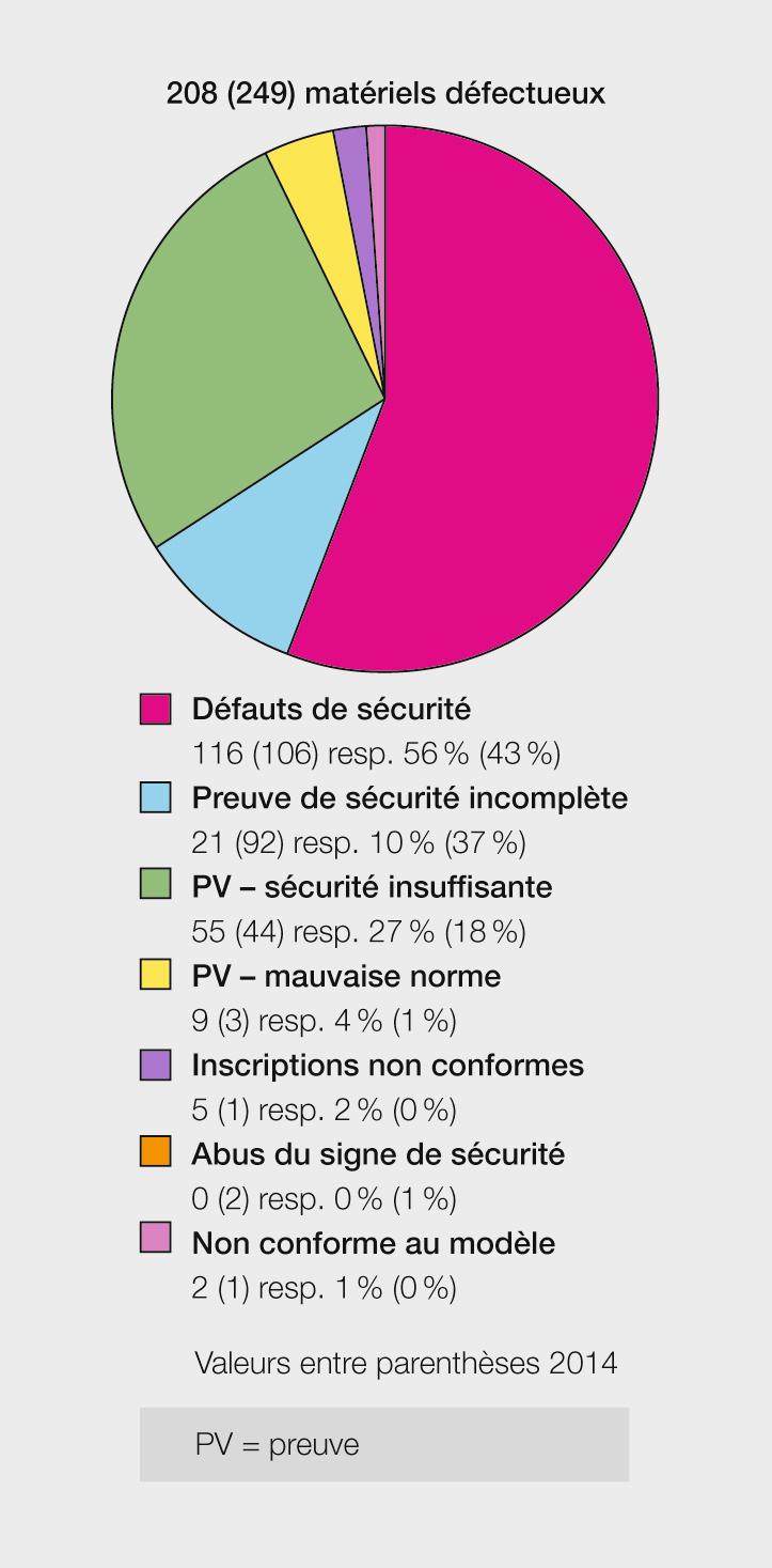 Un matériel électrotechnique sur sept fait toujours l'objet d'une contestation 15 % des matériels électriques contrôlés par l'Inspection fédérale des installations à courant fort ESTI en 2015 présentaient des défauts. 82 interdictions de ventes ou suspensions de ventes ont dû être prononcées. De plus, 17 rappels et informations de sécurité concernant des produits destinés aux consommateurs dans les domaines de l'électroménager, de l'habitat et de l'informatique ont été diffusés publiquement, et les consommateurs ont été informés à cet égard.