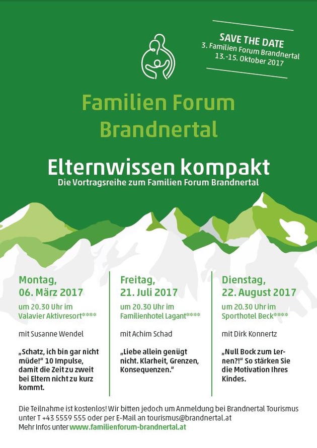 Susanne Wendels Vortrag ist Auftakt für drei Abende, die im Zeichen vom Familienleben mit all seinen Hindernissen und Bereicherungen stehen: Bei "Elternwissen kompakt - die Vortragsreihe zum Familien Forum Brandnertal" geben anerkannte Experten Einblicke, die das Familienleben erleichtern. Die Vorträge sind kostenlos, um Anmeldung wird gebeten: Tourismusbüro Brand, +43 5559 555 oder tourismus@brandnertal.at